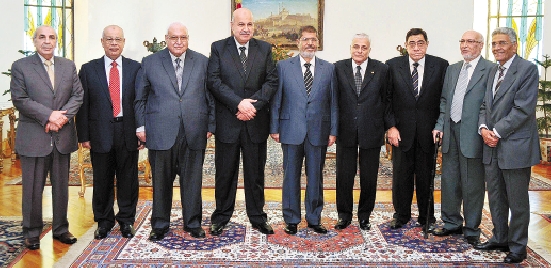 这是10月13日埃及总统穆尔西(中)与阿卜杜勒·马吉德·马哈茂德(右三)等人的合影。 新华社发