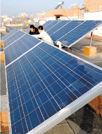 国内首个居民用户分布式光伏电源青岛并网发电。图为1月13日,徐鹏飞(左)向前来“取经”的朋友介绍建在自家楼顶的太阳能光伏发电板。 新华社发