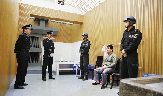3月1日,糯康在过渡监室中,检查自己的着装后,等待着生命的结束。 新华社记者 王申 摄