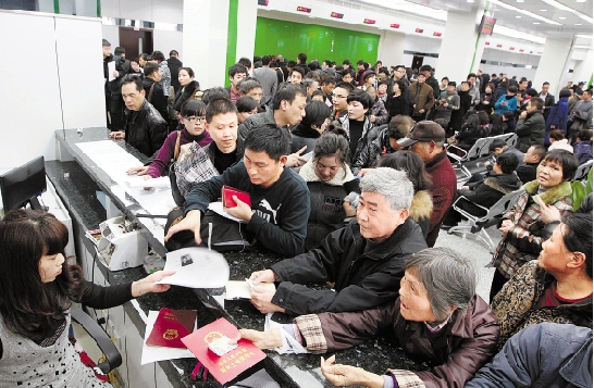 3月4日下午,温州市房屋登记中心大厅内,前来办理房屋产权过户手续的市民挤满了几个办证柜台。郑鹏 摄