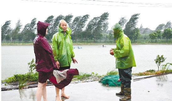 2012年8月8日一大早,工行海宁支行客户经理钱建福(中)、徐国琴(左)顶着强台风“海葵”,向水产养殖户了解受灾情况,帮助复产自救。