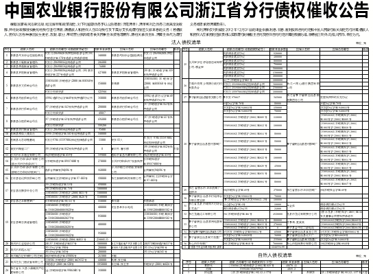 根据国家有关法律法规、司法解释和政策规定,对下列逾期债务予以公告催收(详见清单),清单所列之债务已剥离至财政部,并经财政部授权委托给我行进行清收,请借款人和担保人立即向我行及下属分支机构履行偿还欠款本息的义务 (若借款人、担保人因各种原因发生更名、改制、歇业、吊销营业执照或者丧失民事主体资格等情形,请相关承债主体、清算主体代为履行义务或者承担清算责任)。
