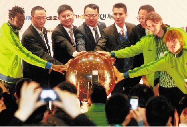 3月4日,杭州绿城队新赛季引进的外援阿甘(左一)、大黑将志(右一)、亚罗林(右二)与俱乐部赞助商代表在发布会上合影。当日,杭州绿城足球俱乐部在杭州举行2013中超联赛主赞助商签约发布会暨新援亮相会。新华社发