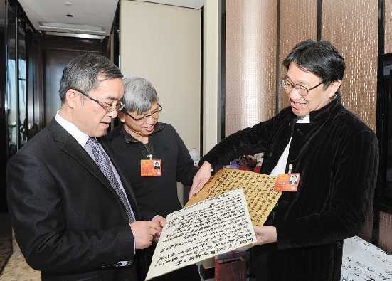 我省全国人大代表陈振濂两会期间每天书写字帖,记录民生话题的所思所想。图为陈振濂(右一)向其他代表介绍“民生书法日记”。