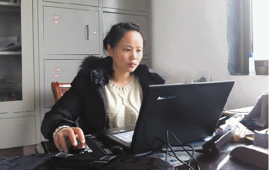 陈薇正在简易的办公室里查找资料,手上长满冻疮。 徐贤飞 摄