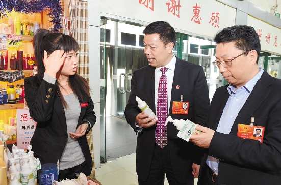 3月4日中午,我省全国人大代表王挺革(右一)、戴天荣(中)利用休息时间,来到代表团驻地附近的小商品市场,了解商品供应和物价情况。