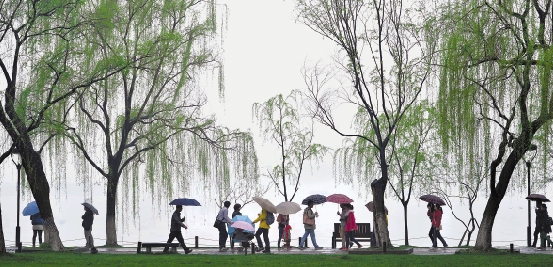 3月17日,杭州下着中到大雨,在西湖柳浪闻莺景区,游客们撑着雨伞欣赏雨中西湖,领略“山色空蒙雨亦奇”的魅力。 本报记者 叶寒青 摄