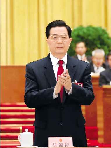 在习近平的提议下,全场代表以热烈的掌声向胡锦涛同志表示衷心的感谢和崇高的敬意。胡锦涛起身致意。 新华社记者 兰红光 摄
