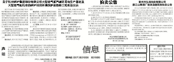 我厅于2013年3月18日受理了杭州锅炉集团股份有限公司提交的杭州锅炉集团股份有限公司大型燃气蒸汽循环发电生产基地及大型燃气轮机余热锅炉项目环境保护设施竣工验收申请材料,根据《建设项目环境保护管理条例》、《建设项目竣工环境保护验收管理办法》和《浙江省建设项目环境保护管理办法》等规定,现将有关内容公告如下: