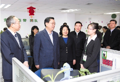 2月22日,张德江在天津天地伟业数码科技有限公司营销中心与工作人员亲切交流。 新华社记者 黄敬文 摄