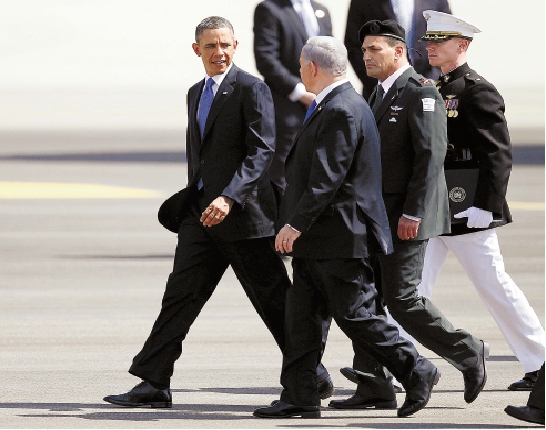 3月20日,在以色列特拉维夫的本·古里安机场,以总理内塔尼亚胡(左二)欢迎到访的美国总统奥巴马(左一)。