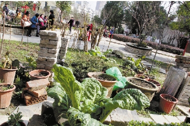 楼下的绿地,盆罐和草坪上,被居民偷偷种上了各种蔬菜。10年来,福明人的菜农情结,尽管已慢慢淡去,但依然有迹可循。 吴晓鹏 摄