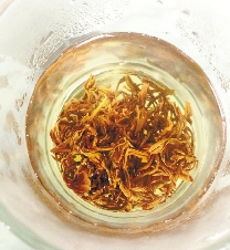 1)泡在杯中的九曲红梅。 2)冯赞玉正在检测机器加工好的九曲红梅。 3)村民楼红盛正在做摊青步骤。 马悦 摄