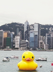 5月2日,世界上最大的橡皮鸭驶入香港维多利亚港。当日,由荷兰概念艺术家创作的巨型橡皮鸭在香港展出。这只黄色的充气橡皮鸭长18米,宽和高均为15米。自2007年以来,这只巨型黄色鸭子已经到访过世界各地的12座城市。 新华社记者 吕小炜 摄
