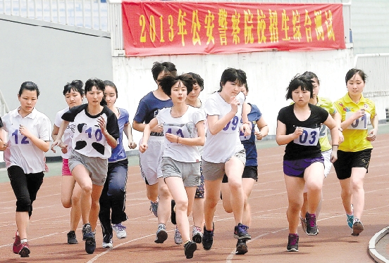 5月2日,2013年公安警察院校招生综合测试在浙江警察学院举行。今年我省报考公安警察院校综合测试的考生有6057人。图为考生参加体能测试。