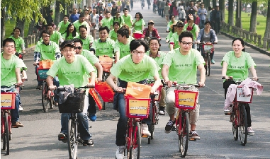 5月3日,杭州市下城区文晖街道组织开展以“绿色文晖、节能减排、青年当先”为主题的自行车环保骑行活动,迎接“五四”青年节。 方圆 王瑞 摄