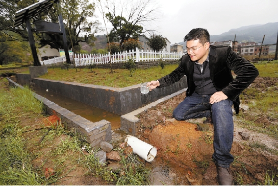 为了证实村口污水处理池的性能,村干部马永斌用玻璃杯舀起一杯清水展示给记者看。