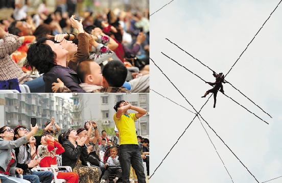 5月5日上午11点,杭州长板巷德胜河畔106米高空,新疆达瓦孜的第六代传人阿迪力上演“跨越巅峰——高空花样走钢丝”。他这次钢丝架设在4幢楼的楼顶,呈十字形,离地106米左右,两条钢丝长110-120米。这是他第一次挑战十字形钢丝,在直径32毫米的钢丝上表演蒙眼走钢丝、高空头倒立等一系列高难度动作,引得下面观众阵阵叫好声。 本报记者 叶寒青 通讯员 朱广立 摄 |