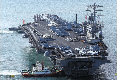 5月11日,美国超级核航母“尼米兹”号战斗群抵达韩国釜山的军事基地,参与韩美军队10日起在朝鲜半岛海域举行的联合海上演习。 新华社发