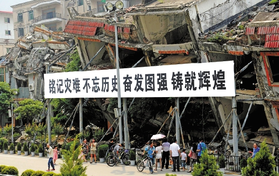 5月11日,四川省北川老县城对群众和游客开放,方便大家祭奠逝者。图为游客在参观北川老县城废墟。 本报记者 梁臻 摄