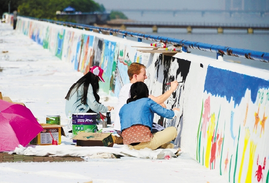 5月12日,大中小学生、残疾人士和社会各界1000多人用彩笔描绘“梦里钱塘七色光”,在钱江三桥至四桥的2公里江堤上绘制了300多幅主题鲜明的作品,加上先前创作的1.5公里海塘彩绘,打破了美国克罗拉多州创造的全长2.1公里的世界吉尼斯纪录,成为世界上最长的彩绘海塘。 吴元峰 吴海平 摄