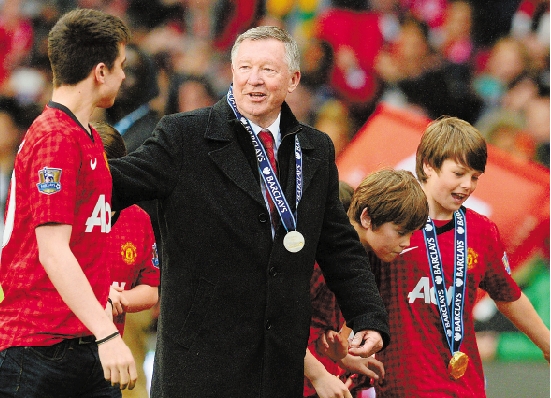 上图为5月12日,曼联队主教练弗格森(左二)与孙儿们在一起。 新华社发