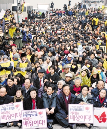 在韩国首都首尔的日本驻韩大使馆前,韩国市民举行“星期三抗议”活动,第1000次为韩国慰安妇讨公道(资料照片)。 新华社发