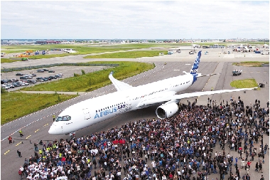 5月13日,在法国图卢兹,空中客车公司(空客)员工庆贺首架空客A350XWB宽体飞机完成整体涂装。首架用于飞行测试的空客A350XWB宽体飞机日前在法国图卢兹完成整体喷漆,这标志着空客这一新型飞机又向预定今年夏季的首次飞行迈进一步。 新华社发 |