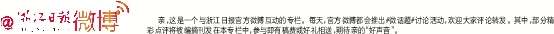 亲,这是一个与浙江日报官方微博互动的专栏。每天,官方微博都会推出#微话题#讨论活动,欢迎大家评论转发。其中,部分精彩点评将被编摘刊发在本专栏中,参与即有稿费或好礼相送,期待亲的“好声音”。