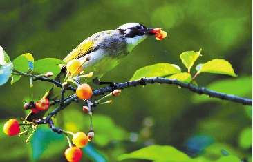 近日,杭州植物园樱桃成熟,成群的白头翁在树上跳来跳去,享用成熟的樱桃果。 通讯员 来顺兴 摄