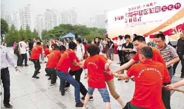 5月18日,在杭州下城区楼宇社区社团文化节上,青年们在进行拔河比赛。文化节将持续到11月,以丰富楼宇白领的文化生活。 通讯员 郑斌 李小兵 记者 戴睿云 摄