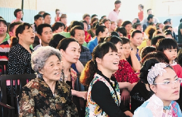 在贺村镇大礼堂,舞台上歌舞飞扬,舞台下的村民也乐在其中。