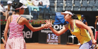 5月19日,海峡组合彭帅(右)与谢淑薇庆祝夺冠。当日,在罗马网球大师赛女双决赛中,彭帅/谢淑薇以2比1战胜卫冕冠军意大利组合埃拉尼/文奇,获得冠军。 新华社发
