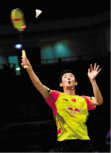 5月21日,中国选手谌龙在比赛中回球。 新华社发