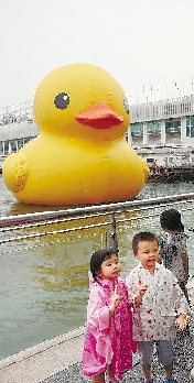 5月22日,小朋友冒雨与大黄鸭合影。 新华社发
