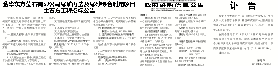 金华东方莹石有限公司,就本公司尾矿再选及尾砂综合利用项目土石方工程以公开招标方式进行确定中标人,欢迎符合相应资格的单位前来报名。