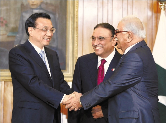 5月22日,国务院总理李克强在伊斯兰堡同巴基斯坦总统扎尔达里、总理霍索举行会谈。 新华社记者 鞠鹏 摄