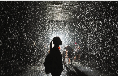 5月22日,观众在美国纽约现代艺术博物馆体验“雨屋”装置艺术展。“雨屋”是随机国际(Random International)艺术组织在美国纽约推出的一项大型现代装置艺术展,该展览以其独特的数字三维为基础,利用数字技术控制雨水的下落,当观众的身体经过一个落雨的环境时,可以停止雨落。 新华社记者 王雷 摄 |