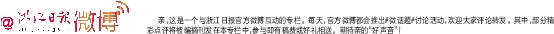 亲,这是一个与浙江日报官方微博互动的专栏。每天,官方微博都会推出#微话题#讨论活动,欢迎大家评论转发。其中,部分精彩点评将被编摘刊发在本专栏中,参与即有稿费或好礼相送。期待亲的“好声音”!
