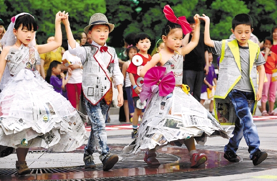 5月24日,一场儿童环保时装秀在桐乡举行,孩子们身着废旧物品做成的礼服登台走秀。