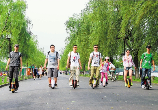 5月25日,一款奇特的独轮电动车驶上西湖白堤。据了解,这是一种新型环保的健身娱乐交通工具,采用锂电池驱动,最高时速15公里,一次充满电可跑近30公里。
