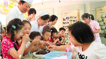 杭州东园婴幼园厨师比拼厨艺,请孩子品尝。 李选 摄
