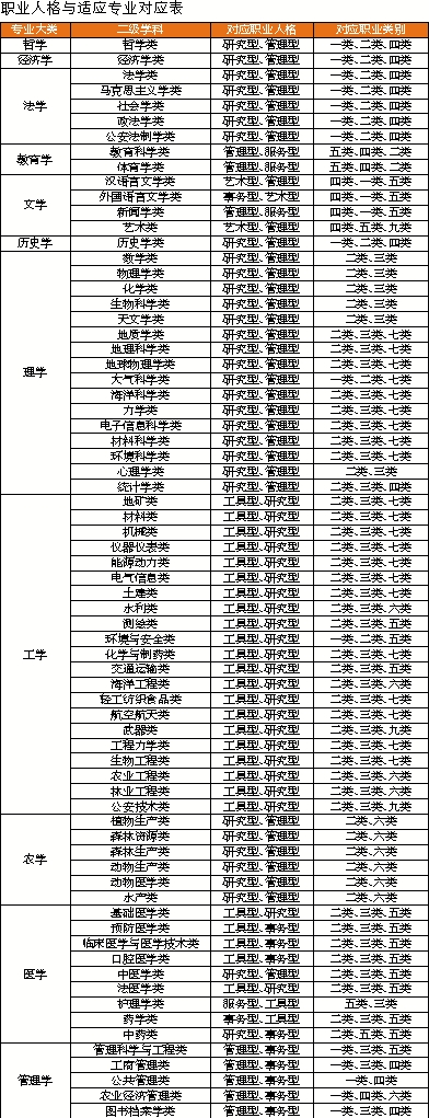 | 专业大类 | 二级学科 | 对应职业人格 | 对应职业类别 |