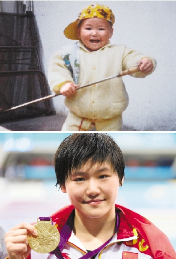 上图:中国游泳选手叶诗文两岁时的照片(翻拍照片)。