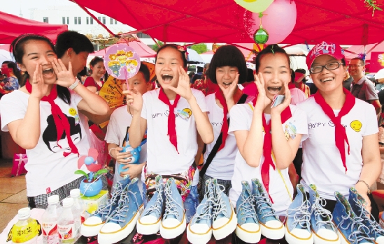 6月1日,瑞安市举办青少年大型欢乐集市活动,18个店铺现场义卖闲置书籍、玩具、鞋子等,爱心善款资助贫困民工子弟上学。