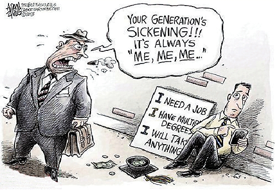 一个年轻人在街头乞讨,身边的牌子上写着:“我需要一份工作,我有多个学位,我什么都愿意做”。近日,国际劳工组织发布的数据显示,到2013年年底,全球15岁到24岁的年轻人中将有7340万人失业,占该年龄段总人口的12.6%。英国《经济学家》周刊则估计,该年龄段人口的实际失业总数接近3亿。 (原载美国政治漫画网) |