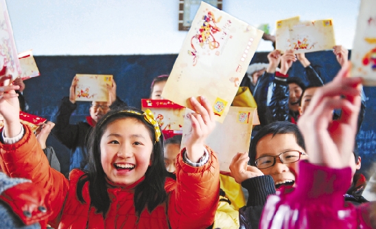 建德广宇希望小学组织留守儿童给远在外地的爸爸妈妈寄贺卡。 宁文武 宋肖汉 摄