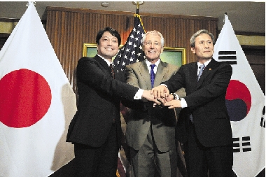 图为2013年6月1日,美国国防部长哈格尔(中)、日本防卫大臣小野寺五典(左)与韩国国防部长官金宽镇在新加坡举行的香格里拉对话会期间举行三边会谈。 新华社发