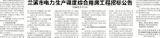 根据《工程招投标管理办法》及兰溪市招投标工作管理有关规定,兰溪市电力生产调度综合用房工程施工实行向社会公开招标。招标人为浙江兰溪市供电有限公司,建设资金来自自筹,项目出资比例100%。项目己具备招标条件,工程造价约7000万元。现对该项目的施工、监理进行公开招标。现将有关事项公告如下: