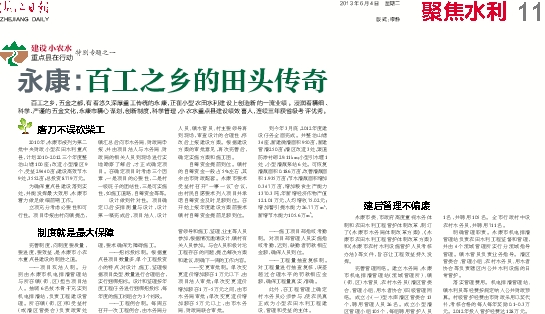 百工之乡,五金之都,有着悠久深厚重工传统的永康,正在小型农田水利建设上创造新的一流业绩。浸润着精细、科学、严谨的五金文化,永康市精心谋划,创新制度,科学管理,小农水重点县建设绩效喜人,连续三年获省级考评优秀。